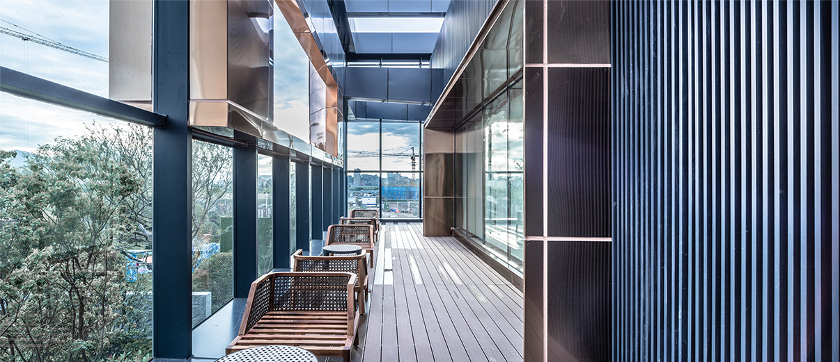 建筑二層的出挑部分的露臺作為室內(nèi)部分與城市的交流空間,結(jié)合玻璃幕墻,成為了放松遠(yuǎn)眺的不二之選。