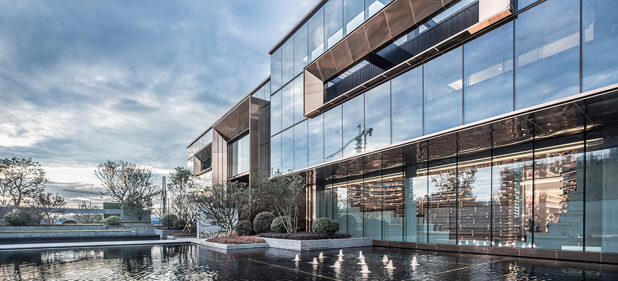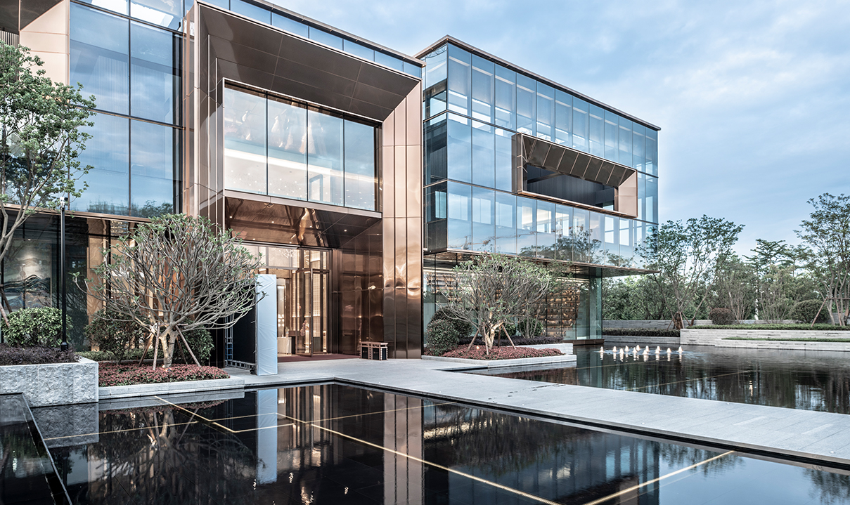 建筑的二層體量作為一個整體坐落于一層體量之上,首層采用具有高透性的超白玻,使二層體量遠(yuǎn)遠(yuǎn)望去仿佛懸浮于城市中的玻璃盒子。同時首層后退引入鏡面水景觀,首層采用的玻璃材質(zhì)使建筑與水景融為一體;沿主入口方向,由香檳色鋼板材質(zhì)包裹的主入口門頭符合訪客尺度,成為建筑亮點的同時,還增加了引導(dǎo)性;建筑首層與二層的相互疊合,一氣呵成,形成有著多重感官體驗的城市空間。