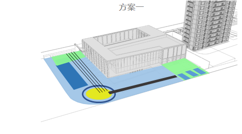 示范區(qū)的設(shè)計(jì)要求是實(shí)景呈現(xiàn),因此需要關(guān)注展示期和永久使用期的無縫銜接。建筑外圈7米寬未來車道界定了總長(zhǎng)度約100米的L形外場(chǎng)空間,景觀軸心很自然地安放在道路轉(zhuǎn)角的節(jié)點(diǎn)處。