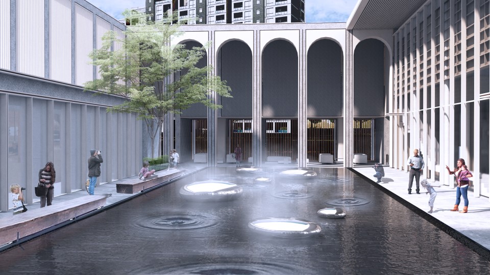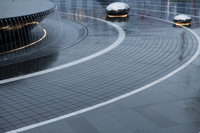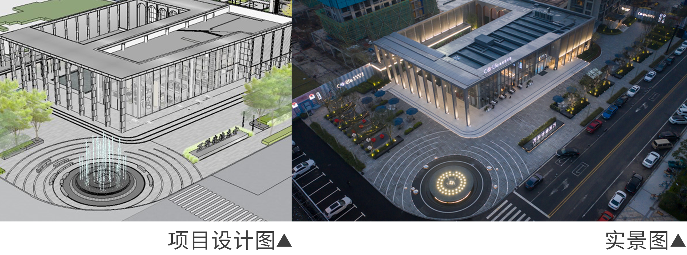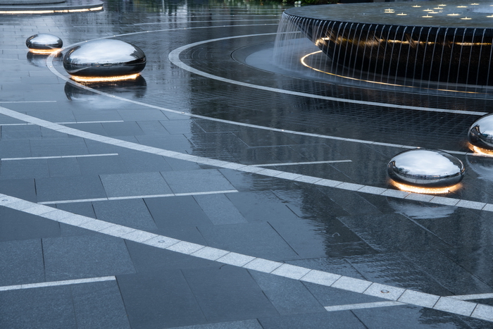 作為從下沙奧萊方向進(jìn)入場(chǎng)地的主要到達(dá)點(diǎn),我們以發(fā)散的同心圓承接住較為剛硬的建筑角部,疆界自然圓融地向外拓展,開放出一個(gè)如同打開雙臂呈迎接狀的“引力口袋”。以紐約林肯中心為設(shè)計(jì)靈感的直徑8.2米的互動(dòng)引力噴泉水盤中,三種不同形態(tài)的噴泉交相輝映,形成熱烈歡快的迎賓氛圍,晶瑩璀璨的鏡面不銹鋼水滴藝術(shù)小品散落四周,營造藝術(shù)互動(dòng)情趣。