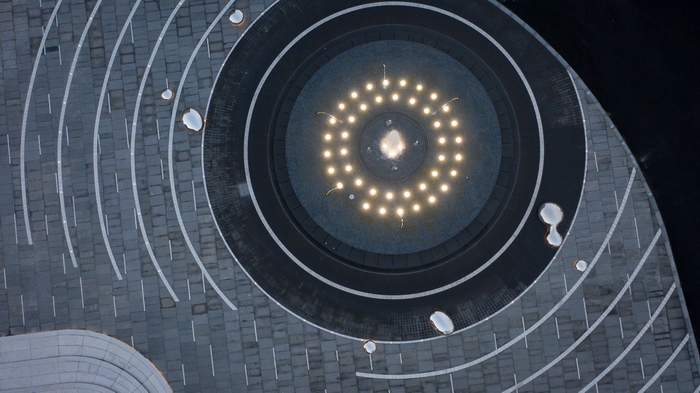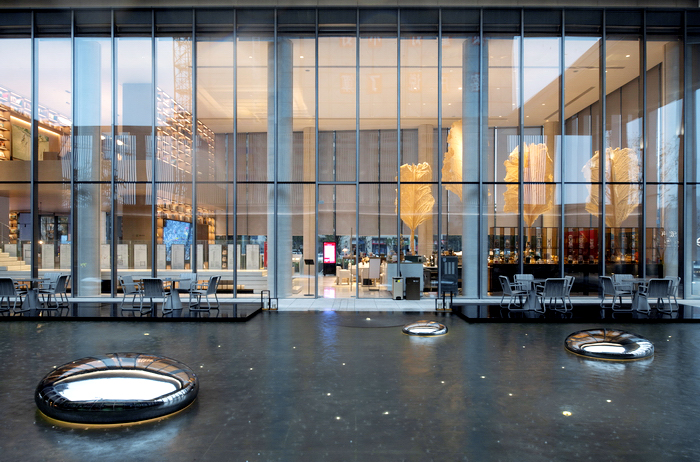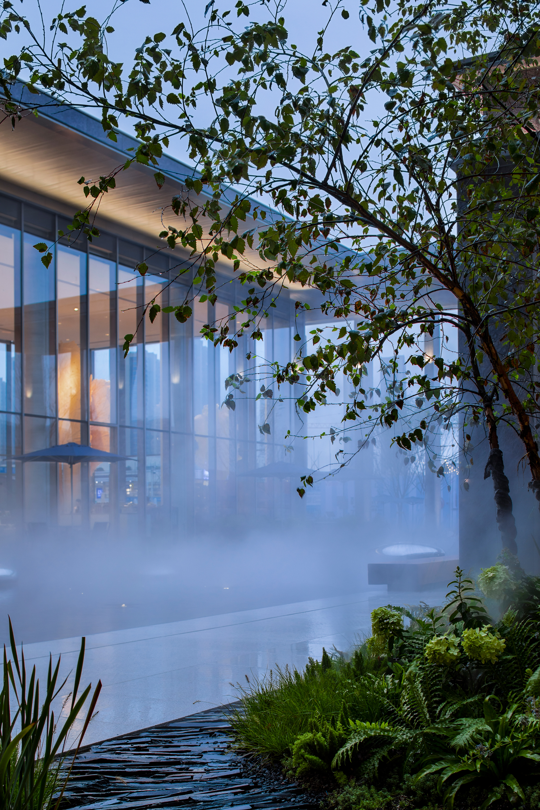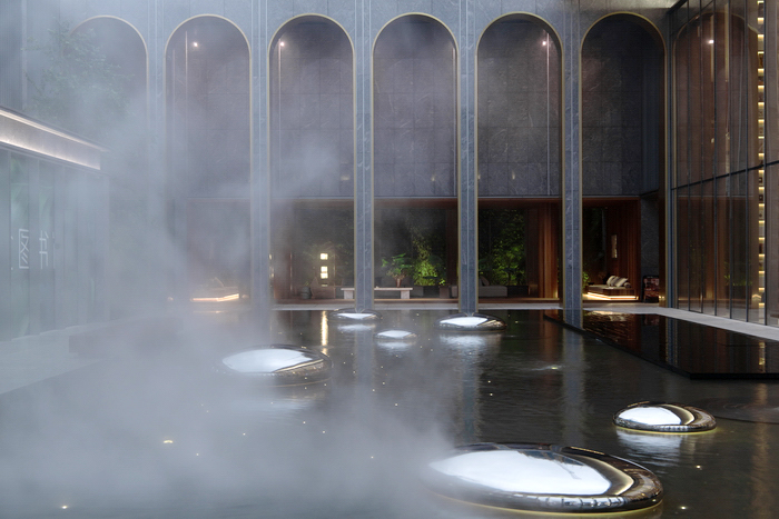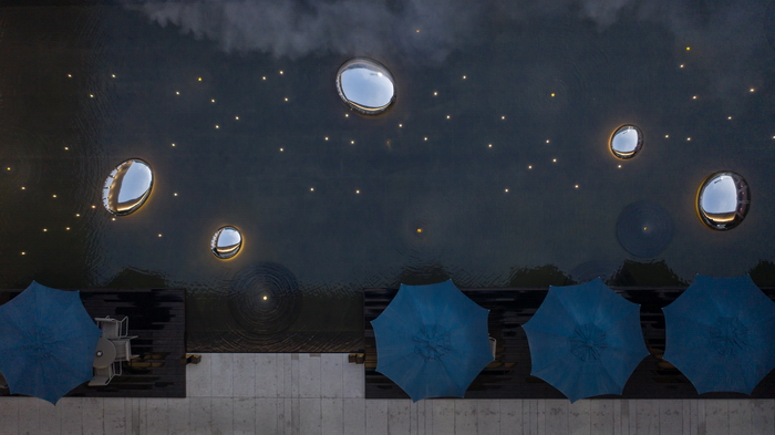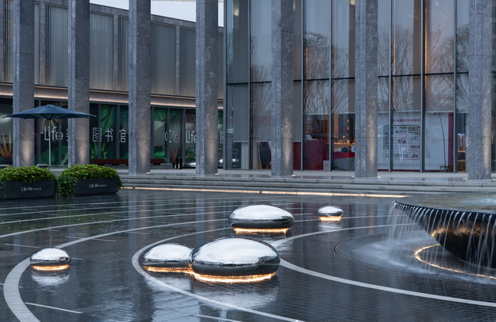 建筑倒映在鏡面水上,輝煌璀璨;星光點(diǎn)點(diǎn)的水池中貼合水面的不銹鋼水滴雕塑群忽明忽暗,如同呼吸的節(jié)奏;霧森如夢(mèng)似幻;漣漪涌泉帶著慢慢蕩開的哲思靜靜地噴涌。