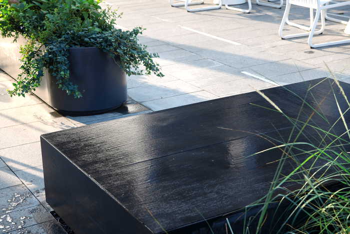 從 “引力口袋”外延的兩翼,黑色特色座墻結(jié)合種植池的做法作為一個(gè)重復(fù)元素形成同建筑節(jié)奏相匹配的序列感。