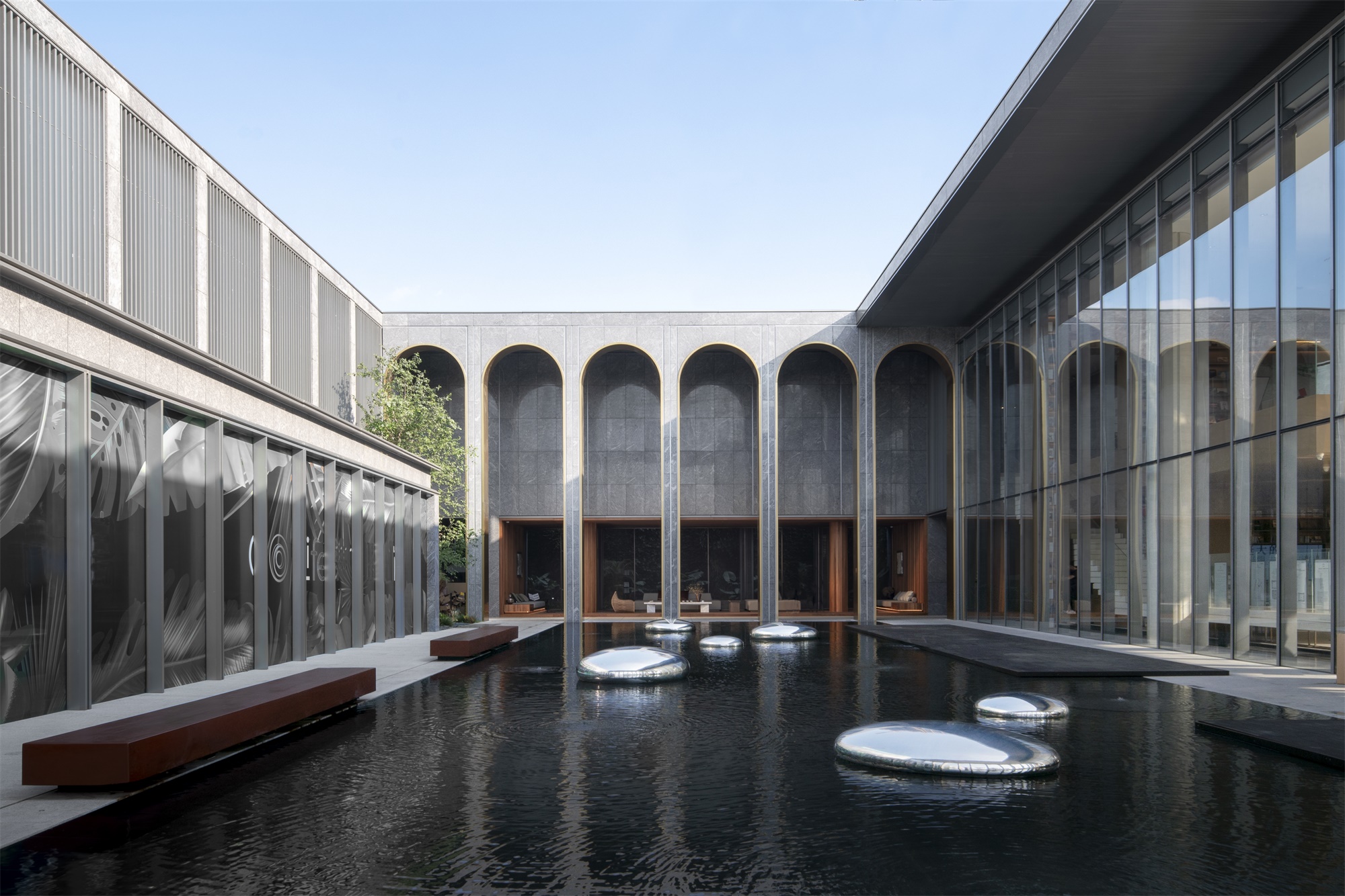10米挑高的建筑柱廊圈出的內(nèi)庭空間 - “無界秘境”是整個(gè)示范區(qū)最具戲劇感的存在。周圈建筑立面顯著的豎線條形成強(qiáng)烈的韻律感。