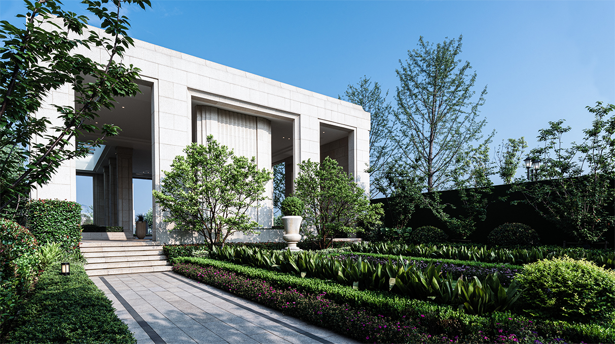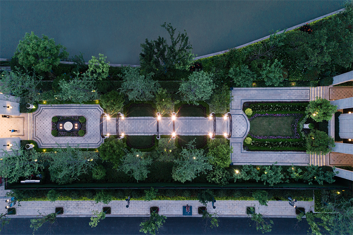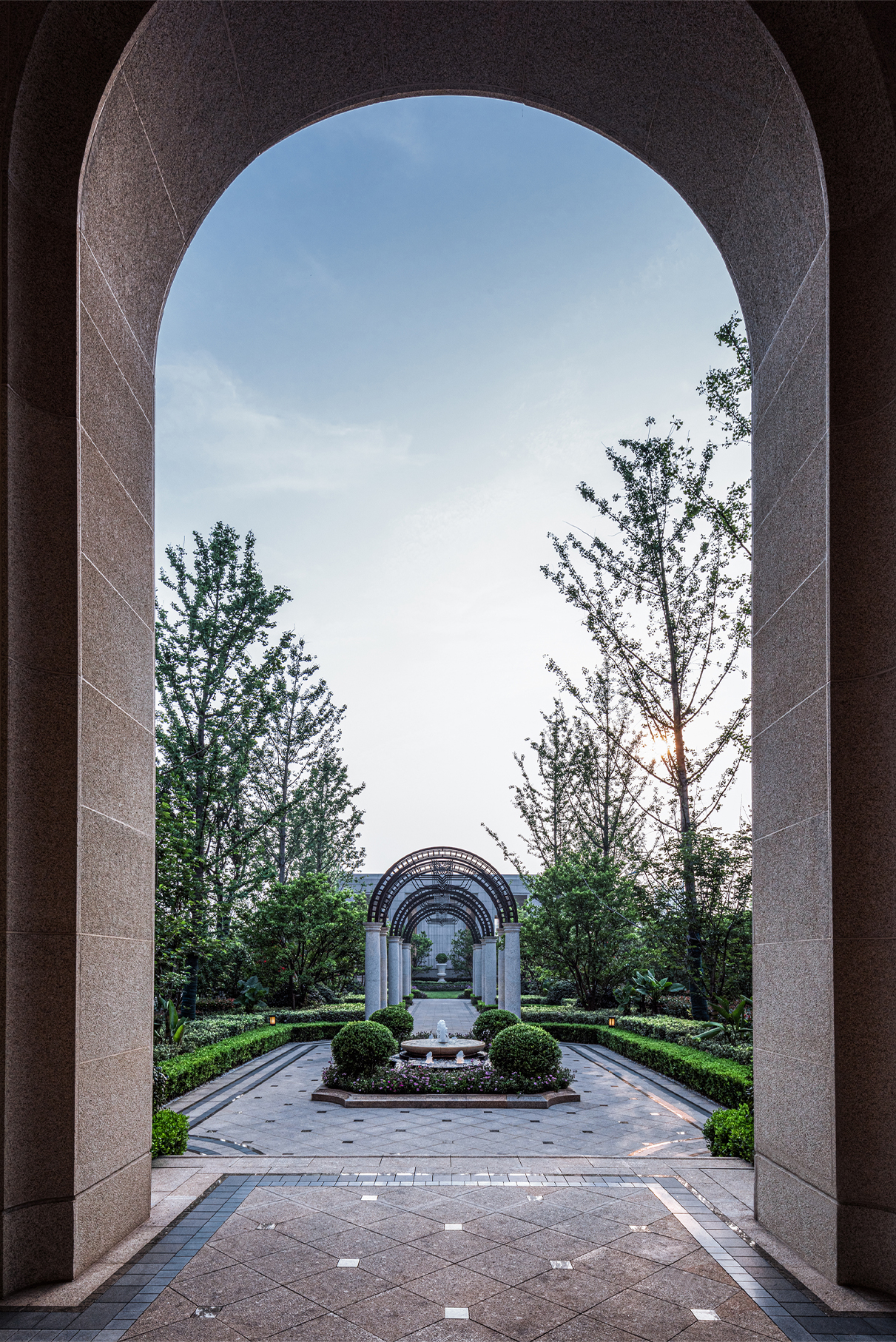 從西側(cè)到達廣場開始,植被陣列清晰界定了廣場的邊界,中心的logo鐘樓昭示了場地精神。整形綠籬、草花和草坪帶來的柔性松弛感,同迎賓大廳硬朗的儀式感形成有趣的對比,暗喻從西裝革履的外面的世界回到了自在溫馨的家的心理轉(zhuǎn)換。