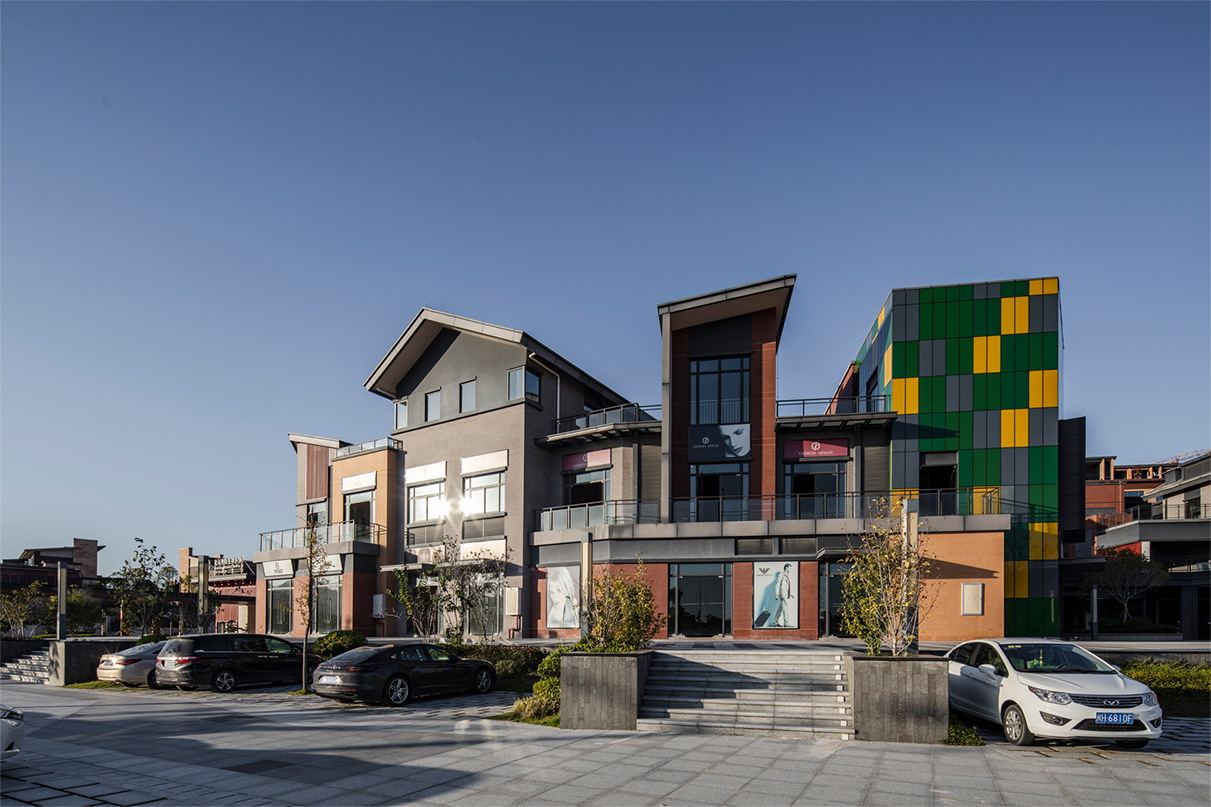 OUTLETS 商業(yè)區(qū)通過商墅本身的橫豎向自由穿插形成各種不同的體量,通過不同材料的變化,加上坡頂?shù)脑O(shè)計,既不失傳統(tǒng)建筑的低調(diào)雅致,又兼顧了現(xiàn)代感。