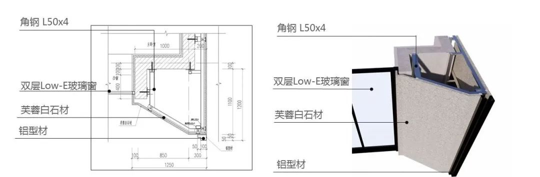 -項(xiàng)目本身受制于成本等因素,大區(qū)立面以土建為主,因此項(xiàng)目中立面的主要線條元素“斜切面”的完成度就成了重要節(jié)點(diǎn)研究對(duì)象。我司通過(guò)與業(yè)主及幕墻等合作方的多方協(xié)商論證,最終選擇了以成品GRC來(lái)取代鋁板幕墻,同時(shí)達(dá)到挺拔現(xiàn)代的美感。